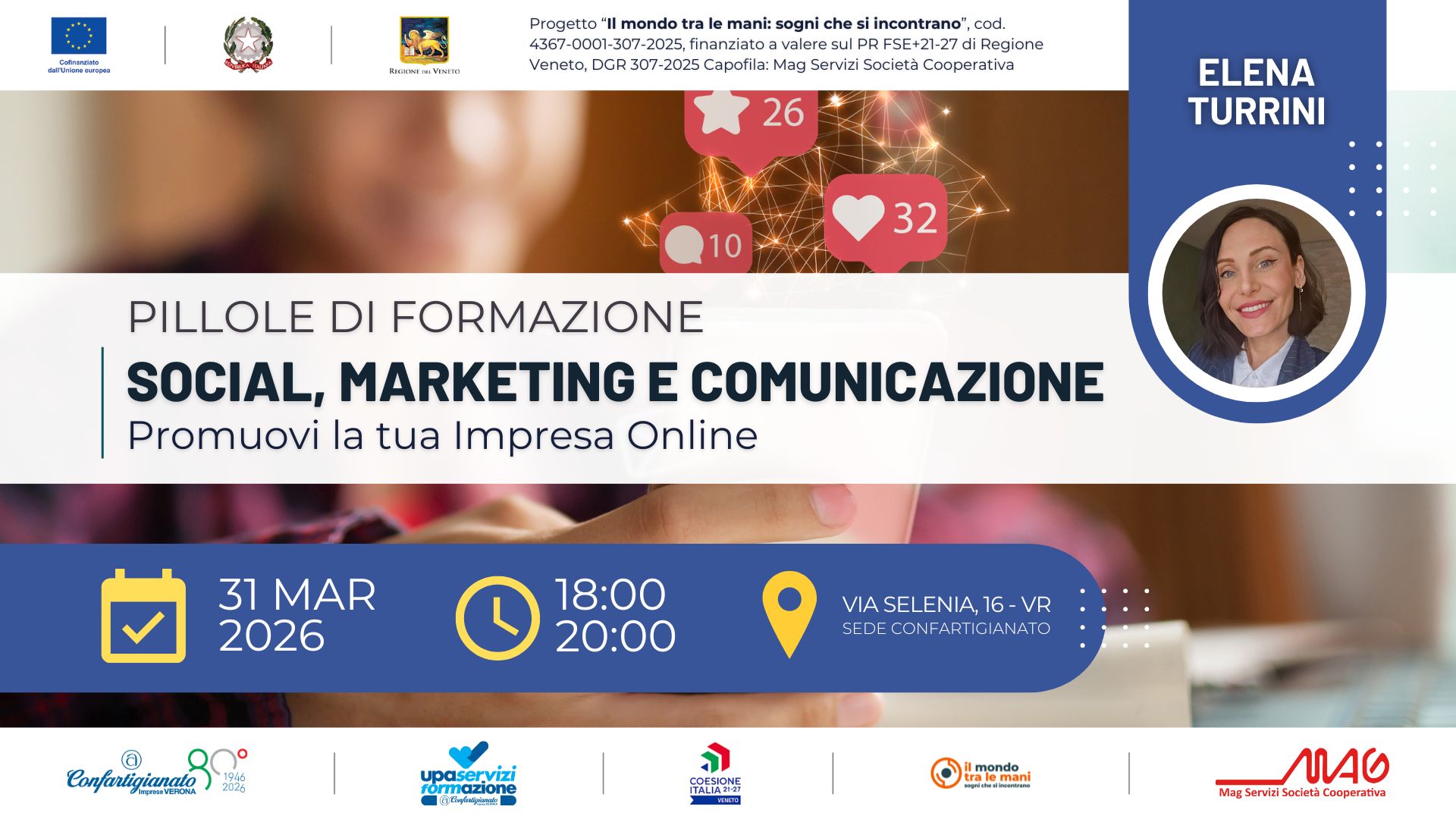 Questa serata è pensata per imprenditori, commercianti e artigiani che vogliono capire cosa sta davvero funzionando nel 2026 e perché spesso l’impegno online non si traduce in nuovi clienti. Parleremo del ruolo dei social nel processo di scelta, dei contenuti che catturano l’attenzione, degli errori più comuni e di quando le sponsorizzazioni possono fare la differenza.